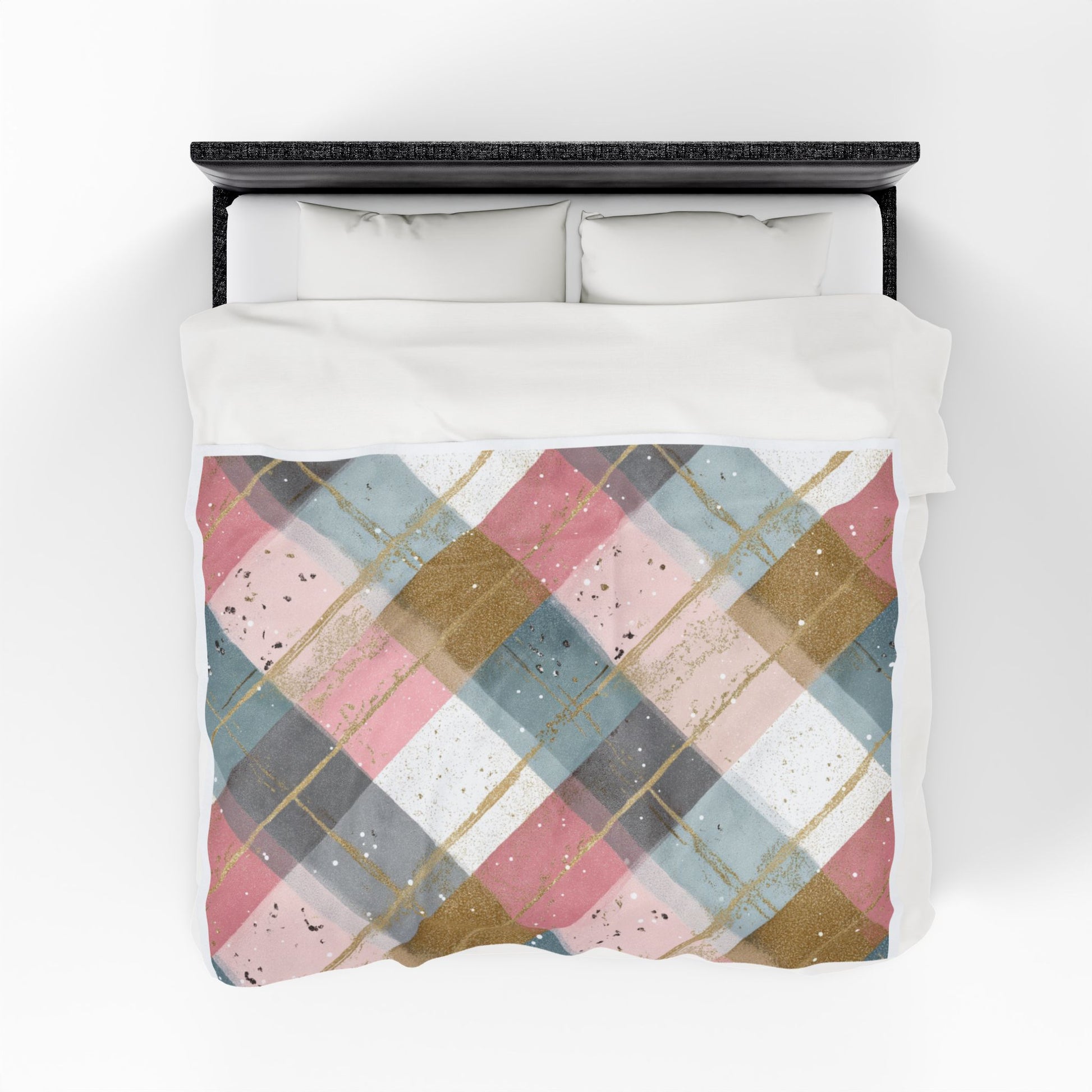 Pastel Plaid Velveteen Plush Blanket — Soft Pink & Gold Cozy Throw
